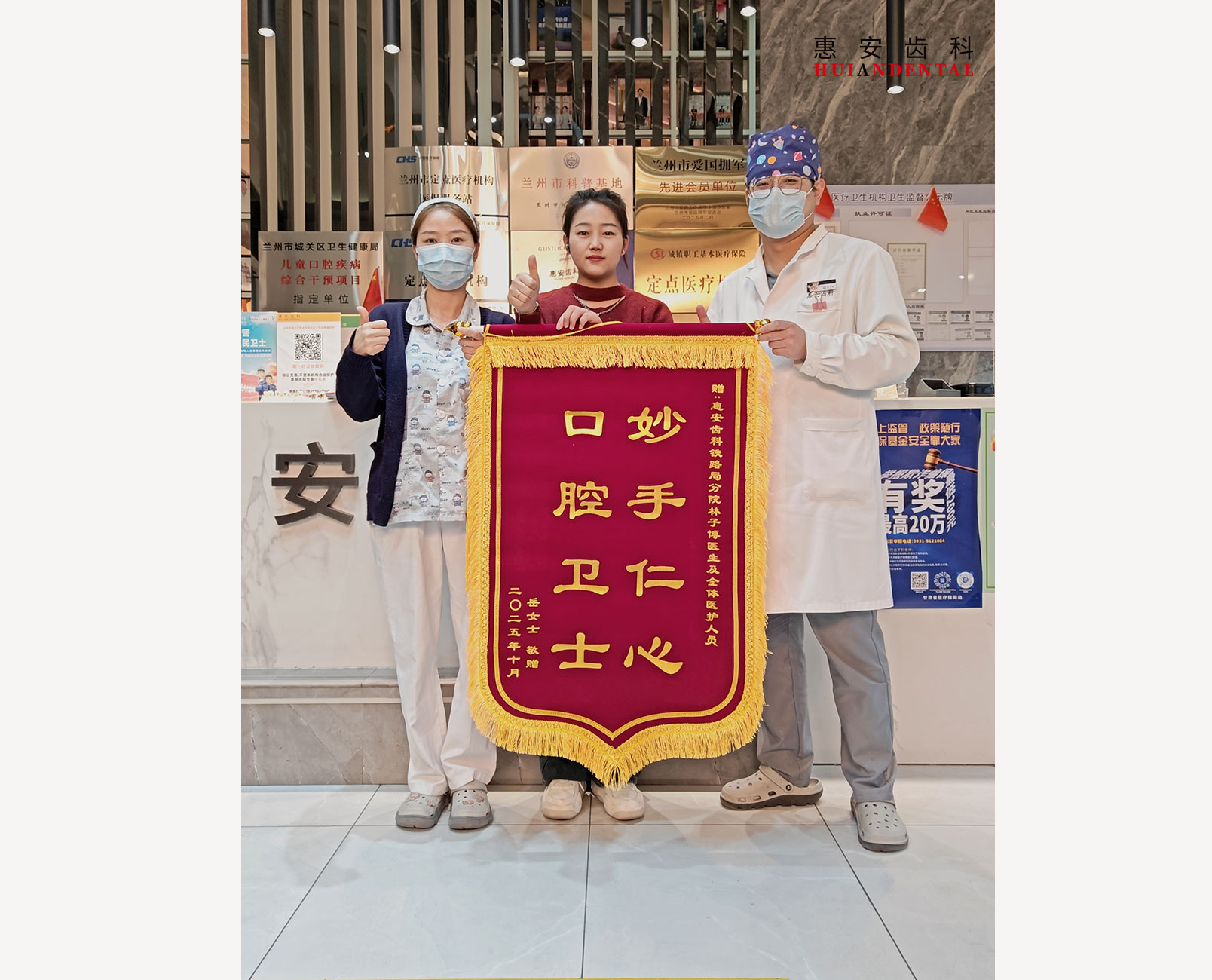 近日,惠安齿科兰州五泉分院再次上演了温馨的一幕。修复科顾客马阿姨在结束治疗后,专程将一面写有“人美心善 医术精湛,尽职尽责 仁心仁德”的锦旗,亲手赠予张莲娣院长及五泉...